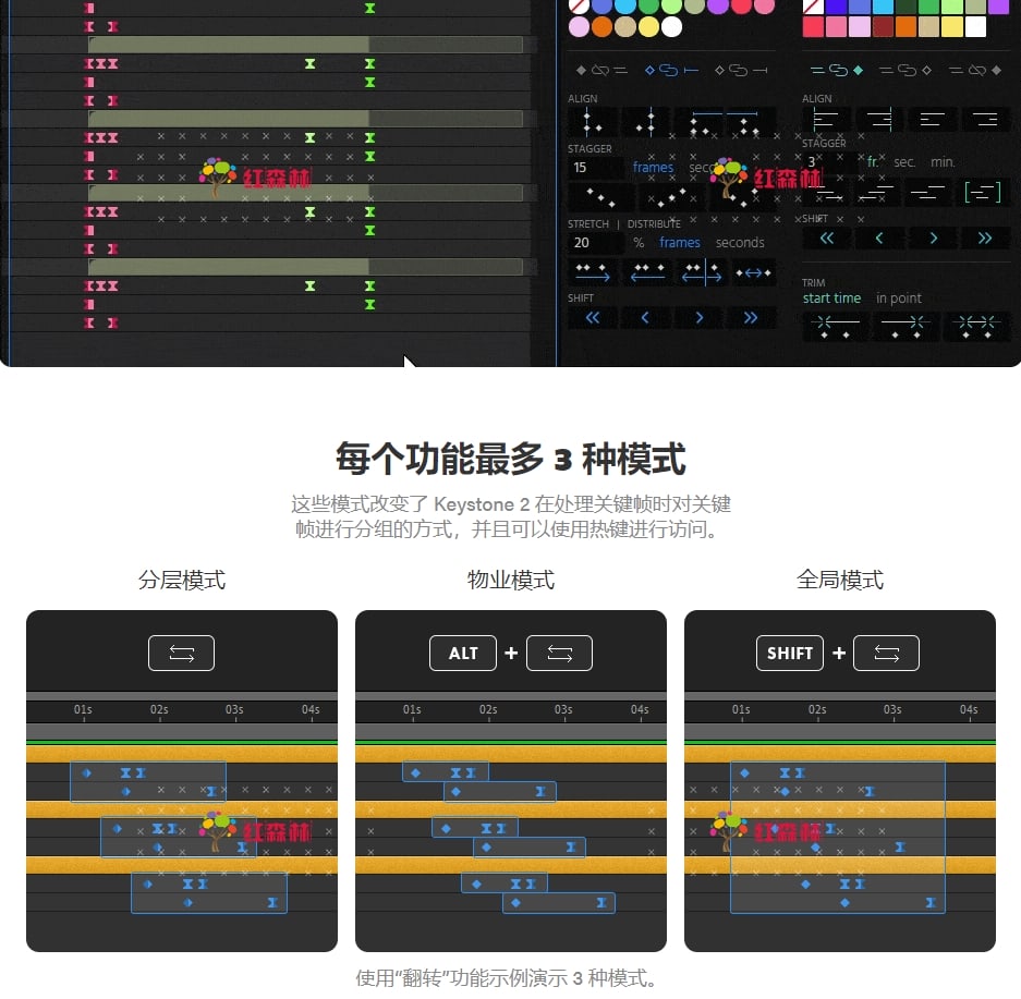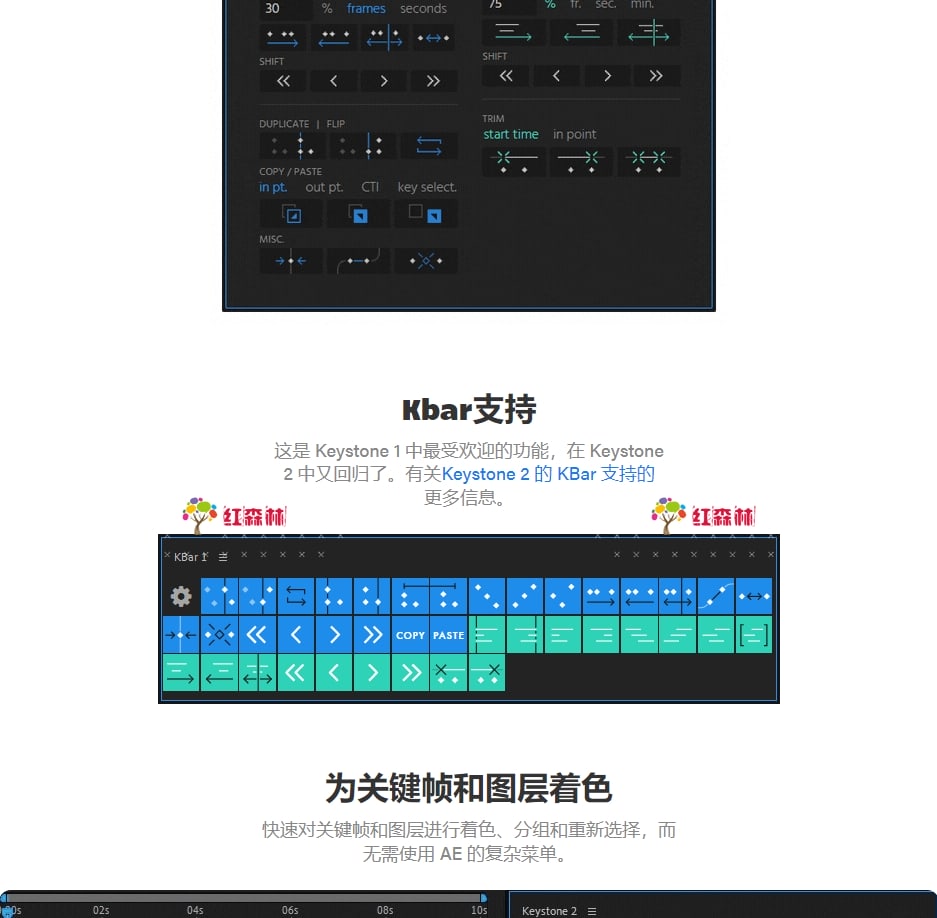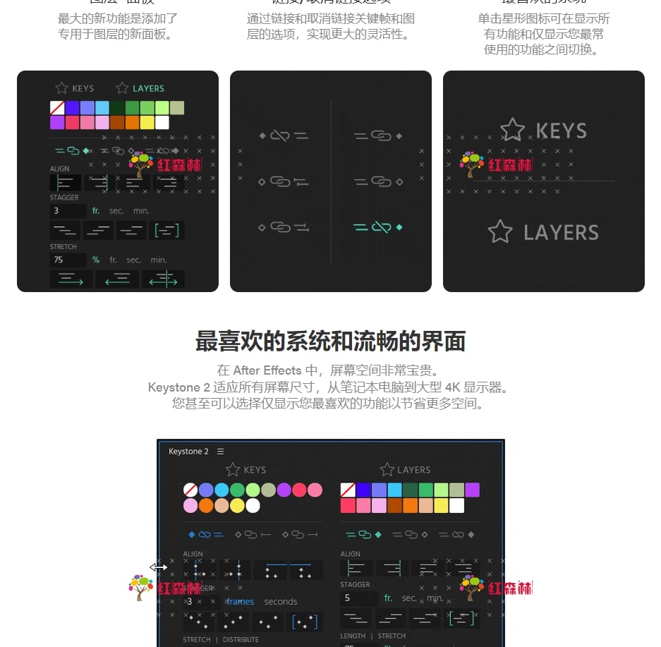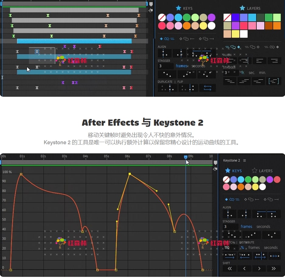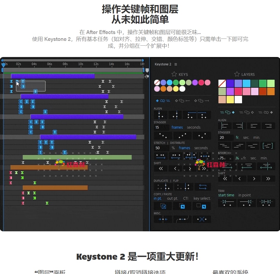 Keystone 2关键帧脚本可以让多个关键帧对齐、翻转、错开、复制、拉伸等等!现在它还支持关键帧颜色标签。在After Effects直接使用关键帧,操作它们可能很乏味。借助Keystone 2脚本基于图标的界面,现在只需点击一下即可完成基本任务。
