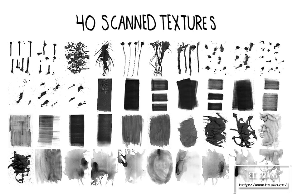 - 扫描纹理 40 个扫描墨水纹理。每一张都以 600 dpi 的分辨率扫描并保存为扁平的 tiff 文件。包括的纹理:滴、滴、涂抹、墨辊、墨迹和墨蜘蛛。