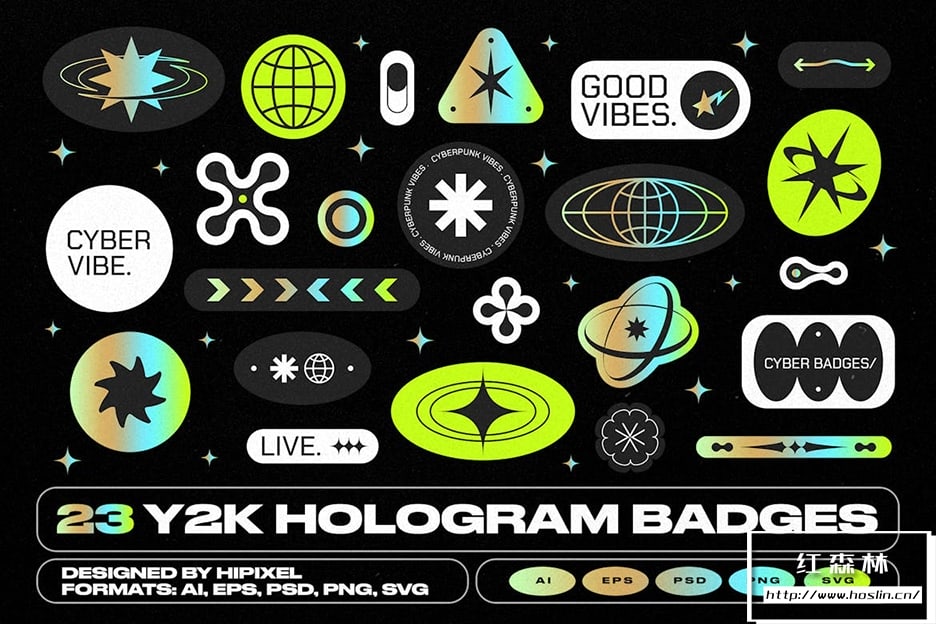 23 张 Y2K 全息徽章贴纸适用于包装设计、拼贴艺术、剪贴簿、贴纸、海报、明信片和所有创意设计。由于矢量形状和组织良好的图层,所有徽章都易于编辑、自定义和调整大小。