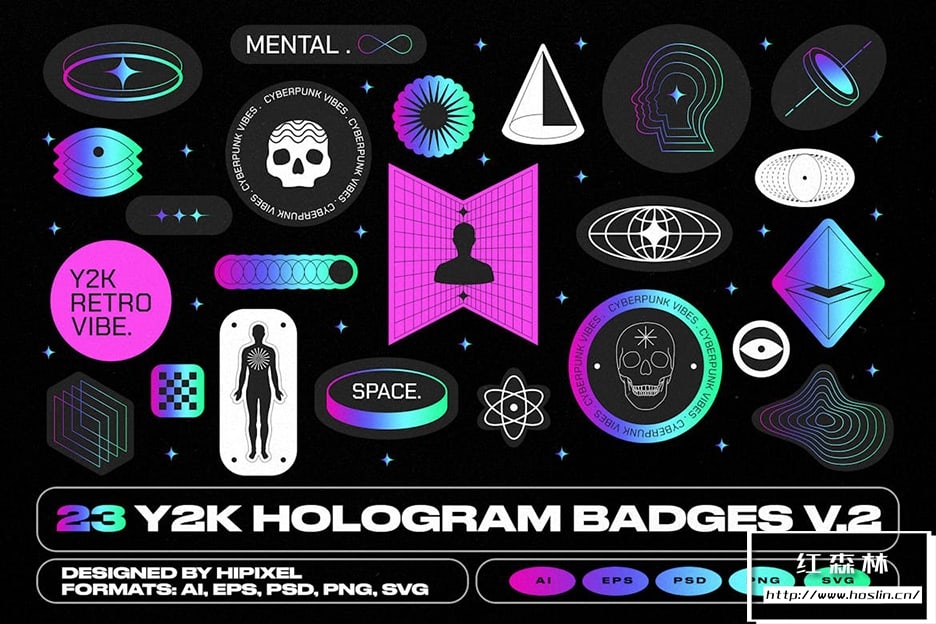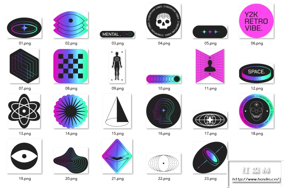 23 张 Y2K 全息徽章贴纸版本v.2 适用于包装设计、拼贴艺术、剪贴簿、贴纸、海报、明信片和所有创意设计。由于矢量形状和组织良好的图层,所有徽章都易于编辑、自定义和调整大小。