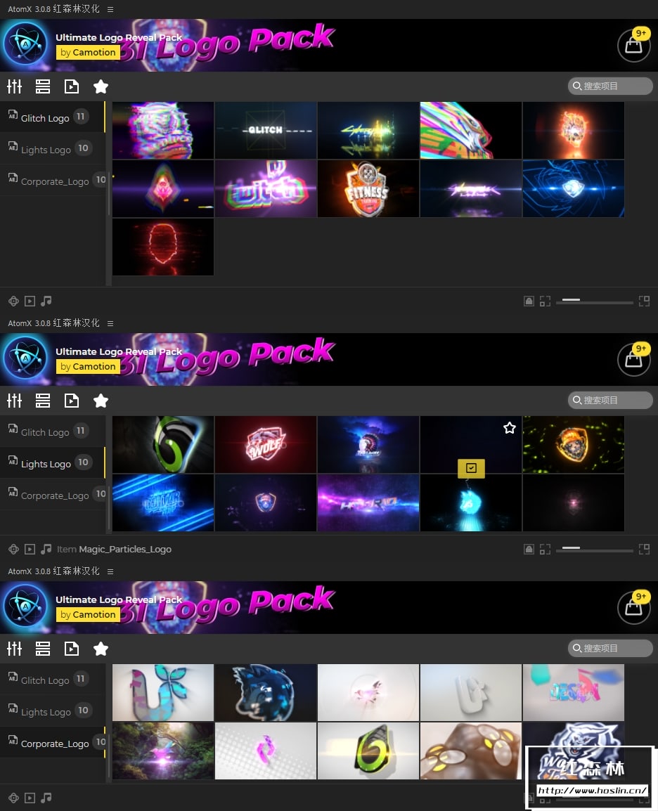 Ultimate Logo Reveal Pack是一个完美的后期效果项目包,由 Atom X 扩展提供支持,可轻松定制您的徽标。此包包含 31 个不同的徽标,11 个故障徽标,10 个灯光徽标,10 个公司徽标,非常适合用作宣传、演示和媒体频道的开场白、简介或结尾。将您的徽标放入编辑文本中,更改颜色并点击渲染。