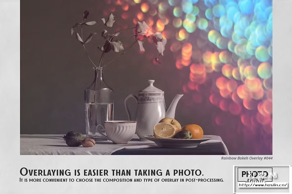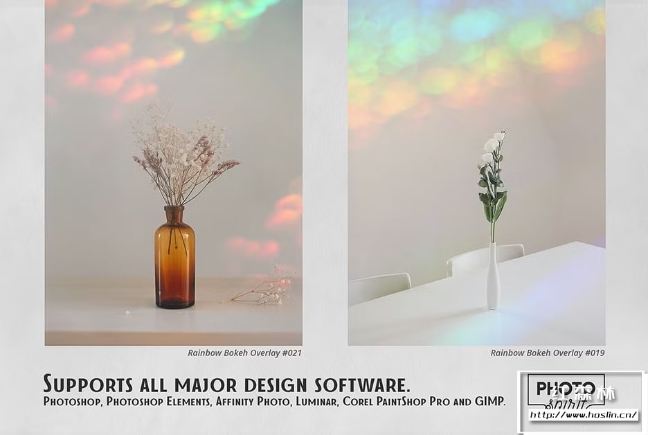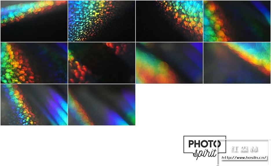 适合业余爱好者和专业人士。彩色和黑白照片上的效果极佳。为了方便起见,添加了在屏幕模式下选择和叠加叠加的操作。这在 Photoshop 和 Photoshop Elements 中均有效。彩虹散景效果叠加可用于任何支持屏幕模式下图层叠加的图形编辑器。