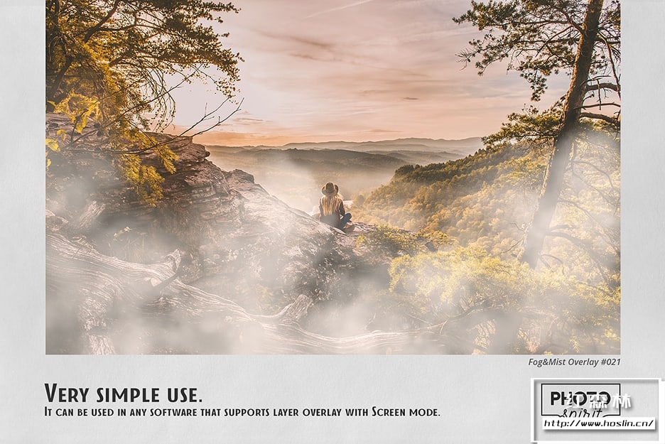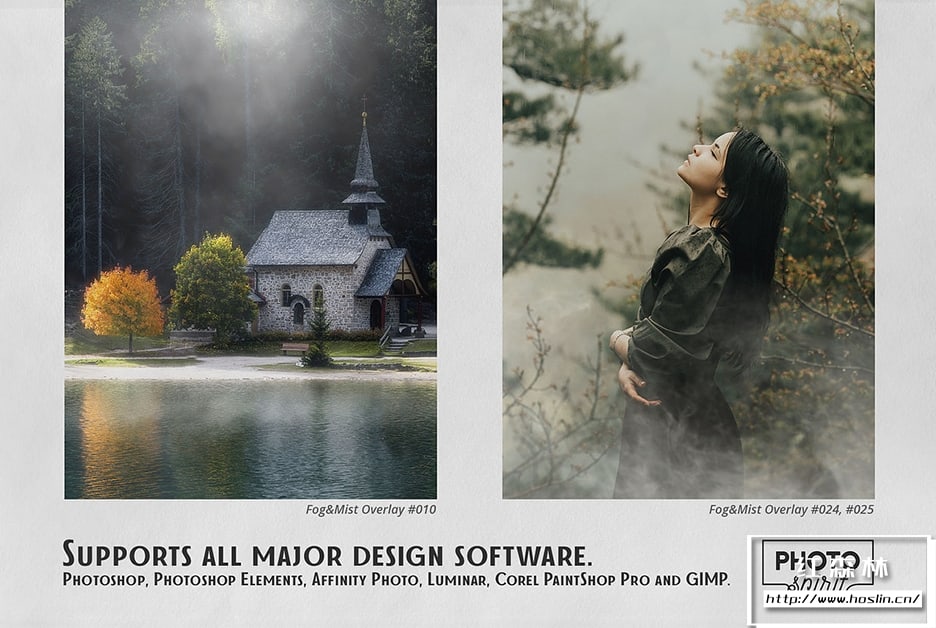 适合业余爱好者和专业人士。彩色和黑白照片上的效果极佳。为了方便起见,添加了在屏幕模式下选择和叠加叠加的操作。这在 Photoshop 和 Photoshop Elements 中都有效。雾和薄雾效果叠加可用于任何支持屏幕模式下图层叠加的图形编辑器。