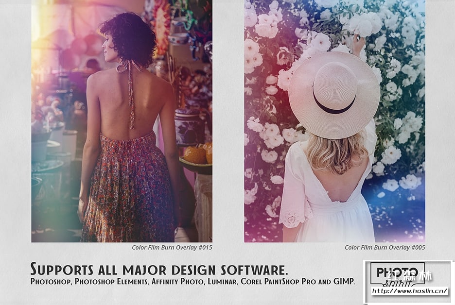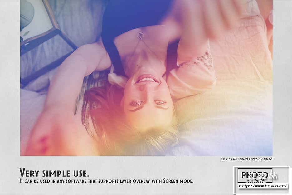 适合业余爱好者和专业人士。彩色和黑白照片上的效果极佳。为了方便起见,添加了在屏幕模式下选择和叠加叠加层的操作。这在 Photoshop 和 Photoshop Elements 中均有效。彩色胶片刻录叠加层可用于任何支持屏幕模式下的图层叠加的图形编辑器。